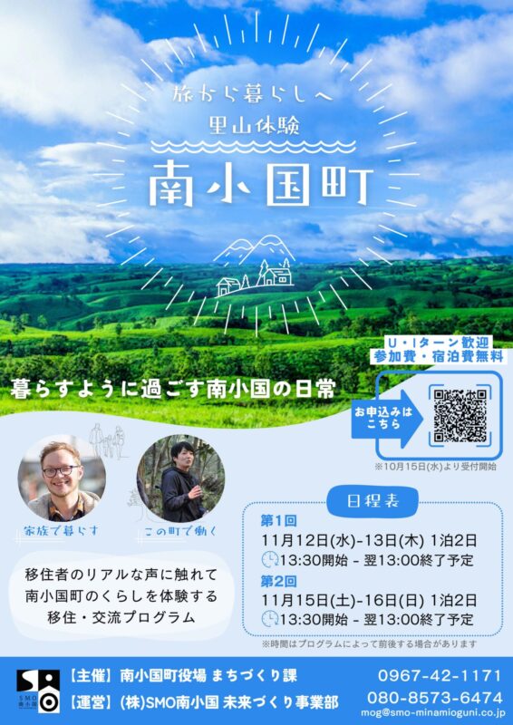 この度、南小国町への移住促進及び関係人口拡大を図ることを目的とした、移住体験ツアーを下記のとおり開催します!